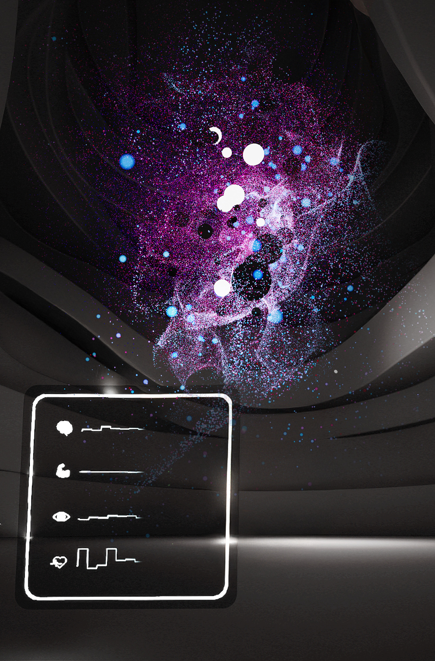 Inspiriert von dem Wunsch, die Komplexität des schlafenden Menschen erlebbar zu machen, verbindet SOMA modernste Technologie mit künstlerischer Visualisierung und wissenschaftlichen Messdaten. Durch die Integration von automatisierten Algorithmen entstehen aus Gesundheitsdaten einzigartige Kunstwerke, welche die vielschichtige Schlafarchitektur kreativ enthüllen.